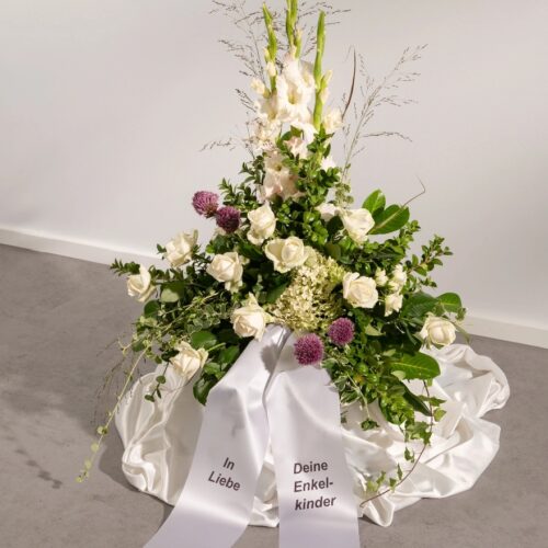 Blumen sind Ausdruck unterschiedlichster Gefühle und symbolisieren die Verbundenheit mit dem Verstorbenen. Blumenschmuck bei einer Trauerfeier kann eine tröstliche, aber auch würdevolle Atmosphäre schaffen. Vielleicht hatte der Verstorbene Lieblingsfarben oder sogar Lieblingsblumen, die wir in die Gestaltung mit einbeziehen können. Gemeinsam mit unserem Floristen-Team gestalten wir den Blumenschmuck oder das Trauergesteck nach Ihren Wünschen und Vorstellungen und schaffen so ein ehrendes Andenken an den Verstorbenen.